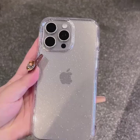El Case Crystal Spark combina transparencia con glitter plateado, dejando ver tu iPhone mientras le das un estilo único y luminoso.